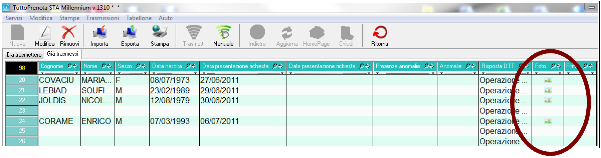 Nel tabellone delle pratiche da trasmettere, e in quello delle pratiche trasmesse, sono state inserite in fondo a destra, due nuove colonne, "Foto" e "Firma". Dunque da questi tabelloni è possibile verificare agevolmente la presenza di foto e firma relative alle pratiche inserite.