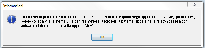 Una maschera di avviso informa che la foto o la firma sono state copiate negli appunti e che, dopo aver cliccato sul tasto "sfoglia", presente in modalità manuale, è possibile incollare i dati copiati.