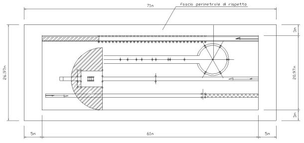 Soluzione 1: circuiti A1 e A2 – A sovrapposti e tutti nello stesso verso. La fascia di rispetto perimetrale ha larghezza di 5 m sul lato in corrispondenza della parte finale dei circuiti e di 3 m sui restanti lati.