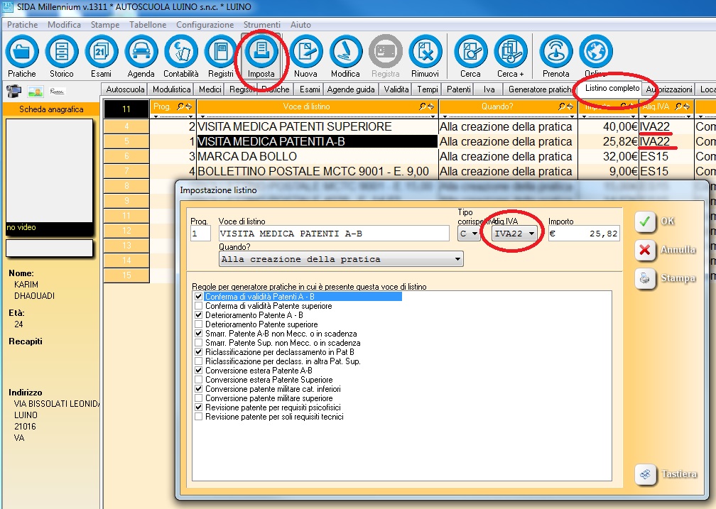 Nel "Listino completo", sempre nella sezione "Imposta", è opportuno correggere tutte le voci con l'indicazione "IVA" in "IVA22".
