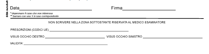 Nella parte bassa abbiamo ricavato uno spazio per l’indicazione delle prescrizioni tecniche, l’eventuale indicazione di scadenza ridotta e l’annotazione del visus. Questi dati possono o tornare in autoscuola per il completamento della trasmissione 2^ fase in automatico con il TuttoPrenota oppure restare semplicemente al medico per esigenza di tutela e archiviazione.