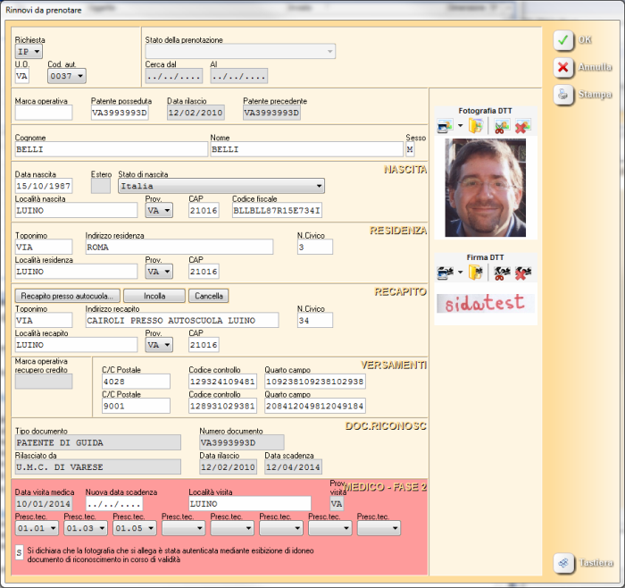 1. Recapito presso autoscuola: compila automaticamente con l’indirizzo dell’autoscuola corrispondente al codice autoscuola utilizzato (seconda riga in altro a sx). NB: l’indirizzo va inserito nella tabella Autoscuole, presente sia nel software SIDA Gestione, sia nel software SIDA Gestione Light.