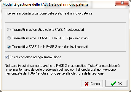 Se l’autoscuola fa la FASE 1 ed il medico trasmette le FASI 2 con il TuttoPrenota alla fine delle visite selezionare la terza scelta “Trasmetti la FASE 1 e la FASE 2 con due invii separati”. Dopo la prima trasmissione (FASE1) le pratiche restano nelle “Da trasmettere” in attesa di completamento da parte del medico per la successiva FASE 2.