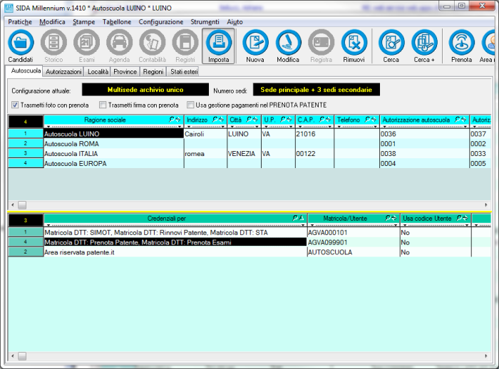 Nella finestra in esempio si vede che la matricola AGVA000101 viene usata per i servizi legati all’agenzia (ex SIMOT, STA, Rinnovi patente).