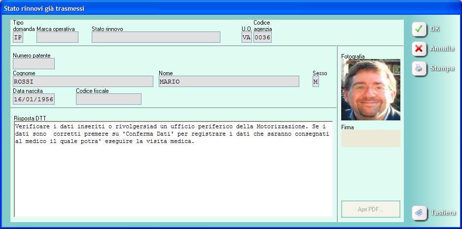 Nel momento in cui, in fase di rinnovo della patente, si riscontrano discordanze tra i dati presenti nell’anagrafe nazionale degli abilitati alla guida e quelli riportati sulla patente da rinnovare o sul documento di identità (es. doppio nome, residenza, ecc), il medico effettua la visita medica, ma il rinnovo della patente non può avvenire telematicamente. Pertanto tutta la pratica deve passare per l'UMC dove l'addetto allo sportello dovrà provvedere all'aggiornamento manuale dei dati. L'autoscuola o lo studio di consulenza automobilistica possono presentare la domanda al posto dell'interessato a patto che siano munite di fotocopia del suo documento di identità in corso di validità. La domanda di duplicato a seguito rinnovo deve essere corredata da: 1) Domanda redatta su modello denominato mod. TT2112, stampabile da SIDA Gestione,debitamente compilato e sottoscritto e fotocopia dello stesso; 4) Stampa della "schermata" generata dal sistema informatico, da cui risulta l’impossibilità di procedere al rinnovo di validità della patente in via telematica - da SIDA Tuttoprenota si provvede a stampare la schermata che riporta la risposta del DTT (fig. 2); 5) Una seconda fotografia identica a quella autenticata dal medico; 6) Patente in originale in visione e una fotocopia completa della stessa (fronte e retro); 7) Carta di identità e codice fiscale con i dati anagrafici aggiornati in visione gli originali e relative fotocopie; 8) Dichiarazione sostitutiva di atto notorio nel caso in cui il conducente intenda allineare i dati anagrafici della patente a quelli del documento di identità (aggiunta doppio nome, variazione cognome, ecc); dichiarazione sostitutiva nel caso in cui il conducente debba presentare una richiesta di duplicato di patente contenente un errore nei dati anagrafici. Queste dichiarazioni sono presenti e unificate in SIDA Gestione con il nome: “Dichiarazione sostitutiva per errori patente” (fig.3) La ricevuta di presentazione della domanda di duplicato, unitamente all'originale dell’estratto dei contenuti della relazione medica, è valida ai fini della circolazione fino alla consegna da parte dell’Ufficio del duplicato della patente di guida con la nuova data di validità, e comunque non oltre sessanta giorni dalla data di rilascio del suddetto estratto.