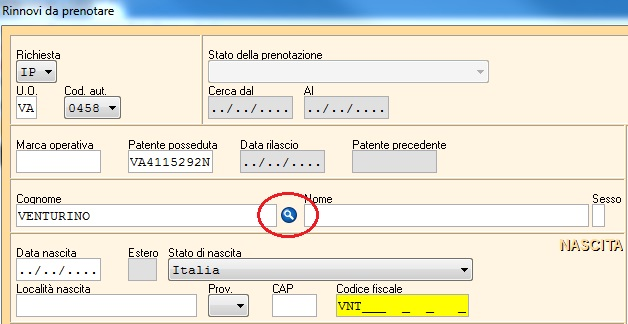 2. nell'inserimento di una nuova conferma di validità è possibile effettuare la verifica di rinnovabilità inserendo cognome e numero della patente (come mostrato in figura) e cliccando sull’icona Lente BLU (cerchiata in rosso in figura):