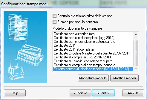 Per forzare questa stampa anche per altre pratiche (duplicato per rinnovo, ad esempio), dalla maschera che appare selezionare la stampante desiderata, cliccare Avanti sui messaggi successivi e scegliere tra le voci Estratto dei contenuti della relazione medica.