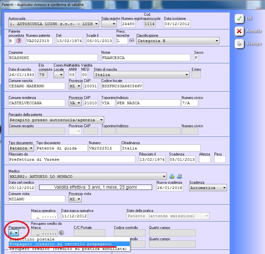 In Pratiche selezionando una pratica di Conferma validità in basso a sinistra troveremo la sezione dedicata a Pagamento. Selezioniamo da Pagamento la voce "P Prepagato" (credito su carrello prepagato): verranno sfruttate e scalate in automatico le pratiche pagate sul Portale dell'automobilista con il sistema “Pagamento pratiche on line”. Sul portale dell'automobilista è possibile pagare, grazie al servizio “Pagamento pratiche on line” una serie di pratiche di rinnovo patente (bollettino 9001 + bollettino 4028 + commissioni bollettini) a scelta, senza recarsi in posta.