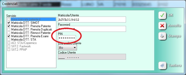 Andiamo su Imposta> Autoscuola e facciamo doppio clic sull’elenco Credenziali per. Si aprirà la maschera nella quale possiamo inserire il PIN rilasciato dal Portale dell’automobilista. Una volta inserito il PIN rimarrà memorizzato e non sarà necessario più necessario reinserirlo.