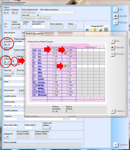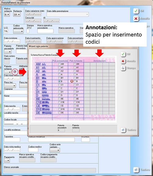 1) Nelle pratiche su indicate, dall'icona ? si apre una schermata dalla quale è possibile selezionare: la tipologia di patente posseduta - il tipo di patente richiesta - le annotazioni tramite codici