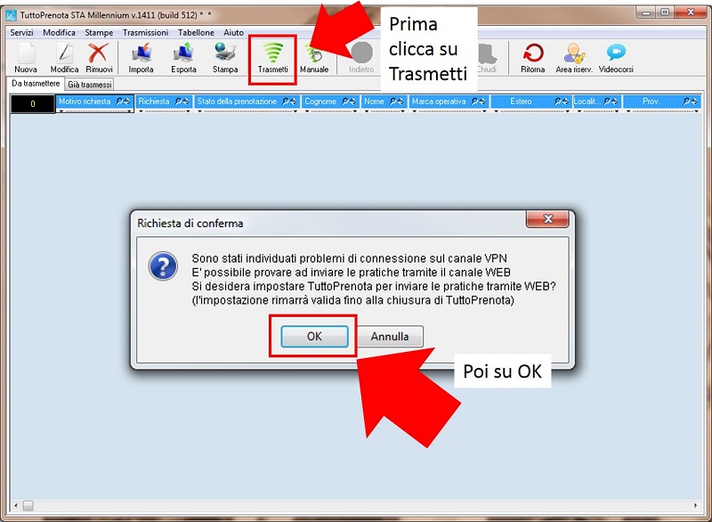 3) a questo punto, compilate la pratica da trasmettere, cliccate su Trasmetti e attendete fino al messaggio qui sotto riportato, sul quale cliccherete OK.