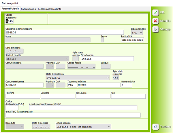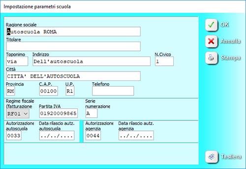 È possibile impostare per ogni sede una serie di numerazione da usare per la fatturazione. L'impostazione viene fatta direttamente in Imposta - Autoscuola.