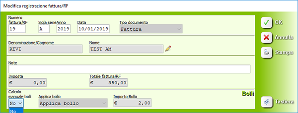 Scegliere prima Si in Calcolo manuale bolli, poi è possibile modificare sia l'applicazione (Applica bollo, Non applicare bollo) che l'importo del bollo.
