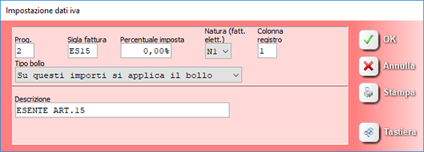 L'impostazione di base di SIDA prevede l'applicazione del bollo sulle aliquote esenti art. 15 e art. 10