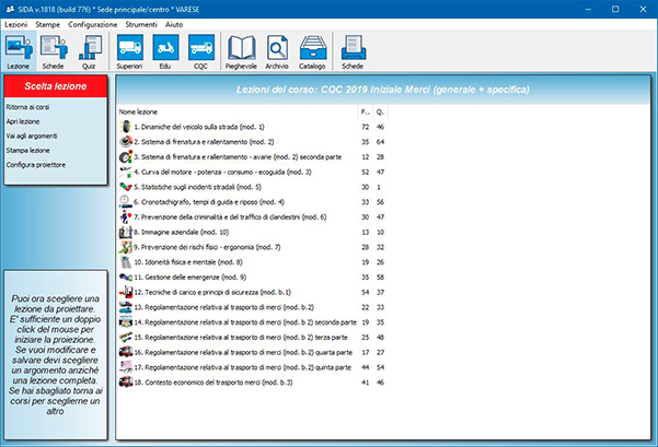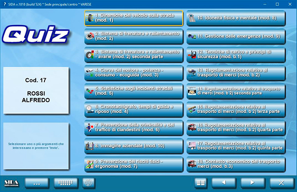 Se, ad esempio, il nostro candidato deve conseguire la CQC merci, SIDA proporrà le esercitazioni per argomento già suddivise secondo le nuove modalità (cioè tutti gli argomenti della parte generale + gli argomenti della parte merci).