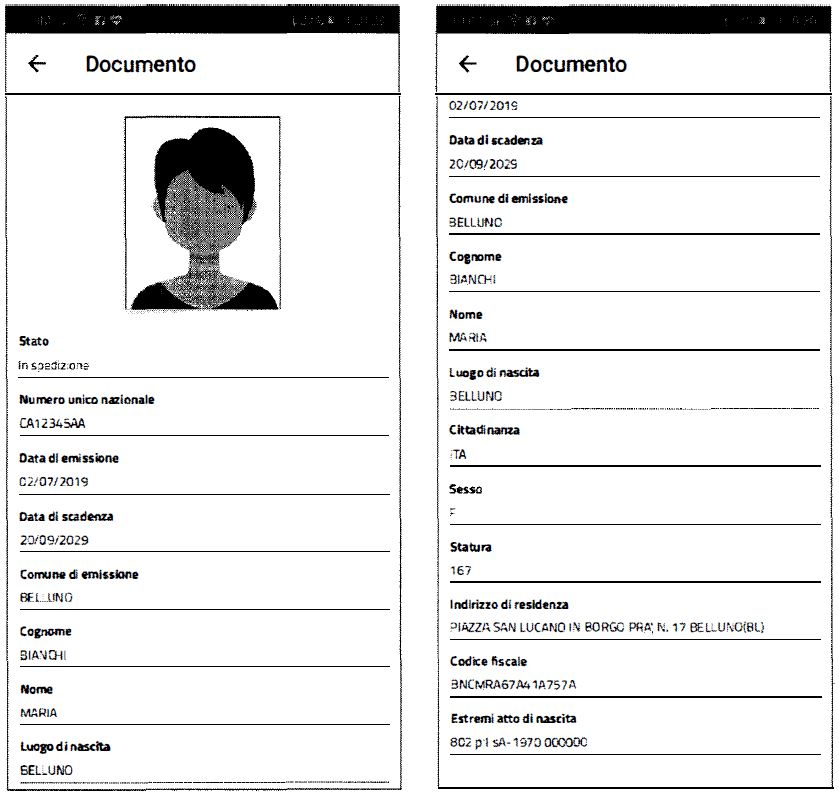 Figura 1. Schermata mostrata in caso di ricevuta autentica e CIE in lavorazione. I dati vengono mostrati in verticale operando uno scorrimento verso il basso sullo smartphone.