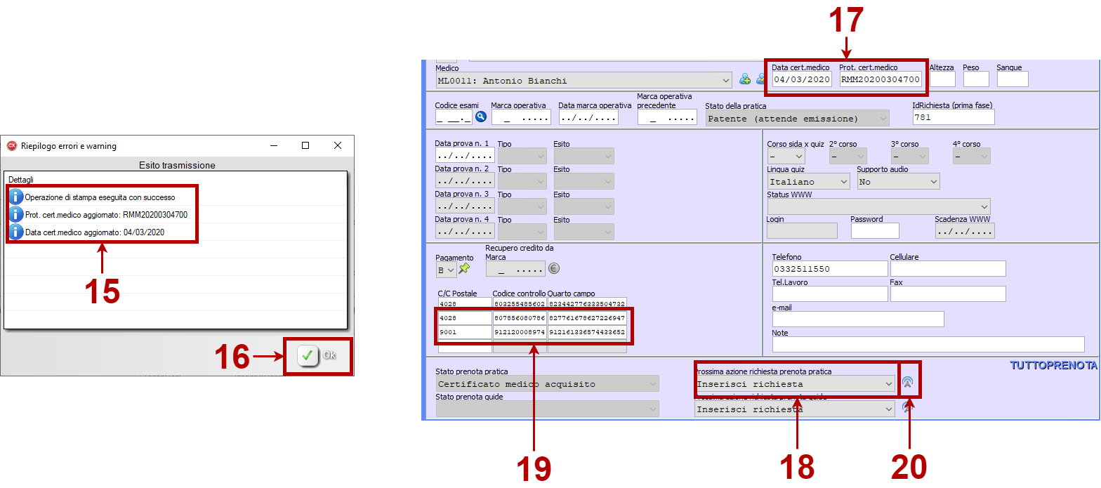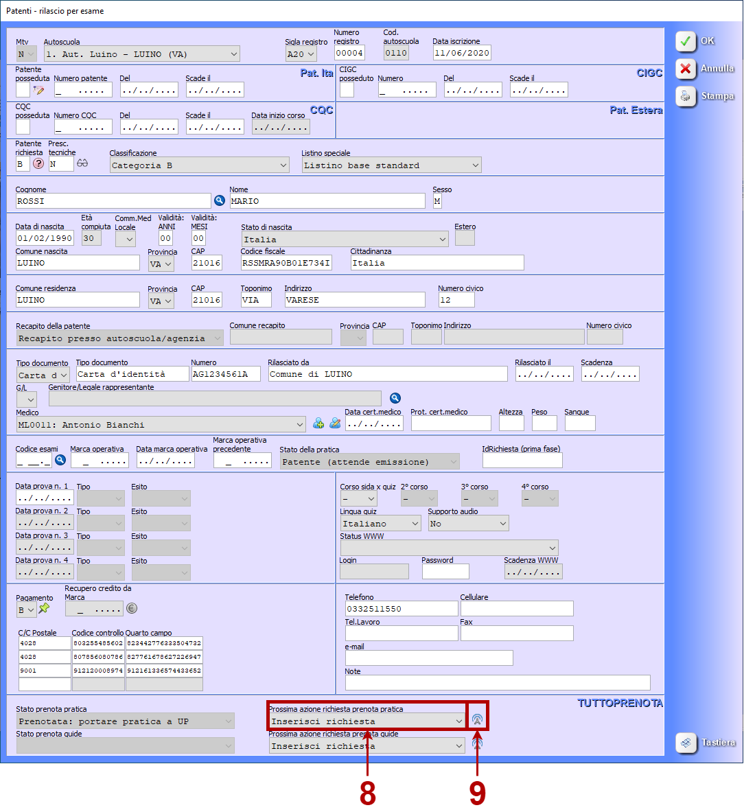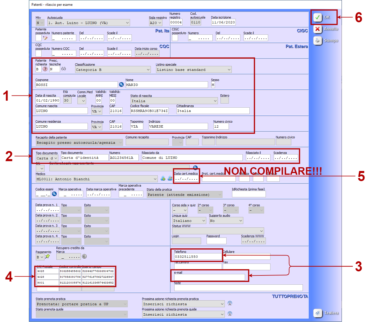 Se l'autoscuola legge il protocollo con lettore di codice a barre, verrà compilato il campo "prot. certificato medico".