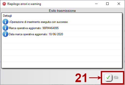 (21) L’esito della trasmissione apparirà in una finestra a video; per terminare la prenotazione premere “OK”