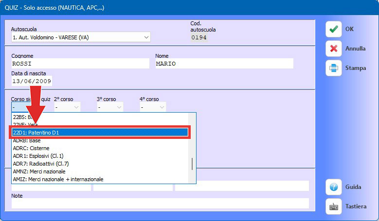 In SIDA Gestione è possibile iscrivere i candidati al corso "patente nautica D1". In questo modo i candidati si potranno esercitare, con codice, in autoscuola. Inoltre, come accade per tutti gli altri corsi SIDA, le esercitazioni fatte con SIDA QuizApp confluiranno direttamente in gestione.