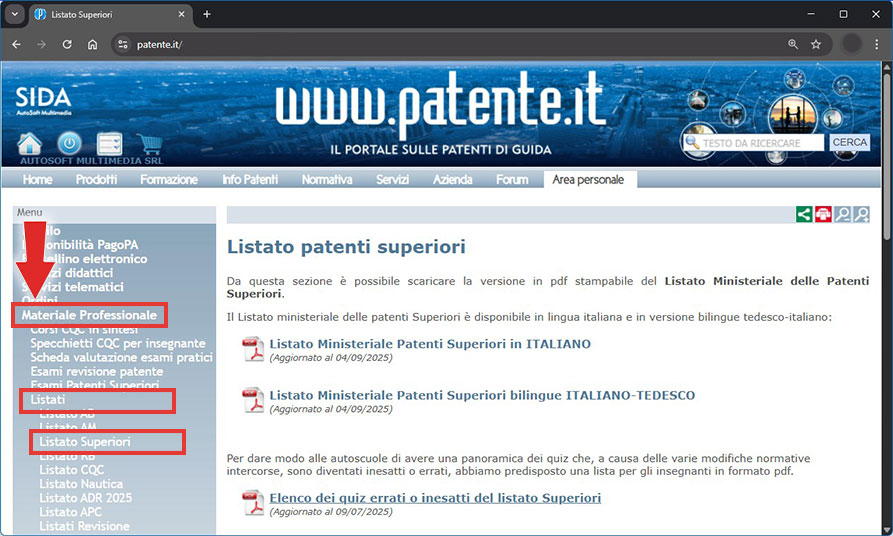 Nella Guida Rapida di SIDA SUP è stato aggiornato il materiale extra che contiene il listato ministeriale e l'elenco dei quiz che contengono errori ministeriali (questo materiale è pubblicato anche nell'area personale del sito www.patente.it).
